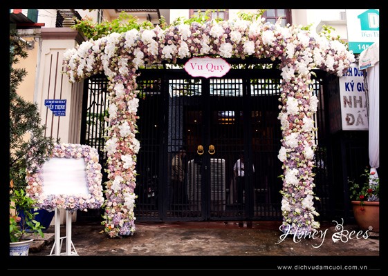 Cổng hoa tươi lớn đặt trước cửa được cắm full hoa và theo khung vòm của cổng chính