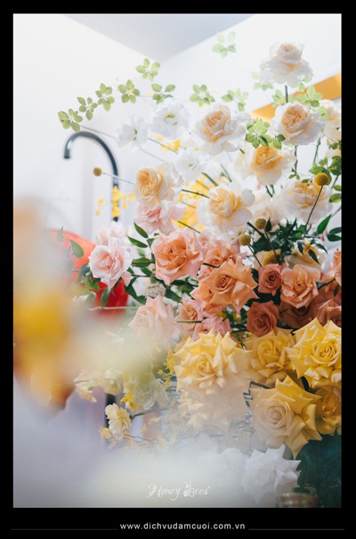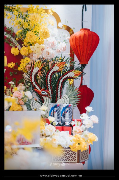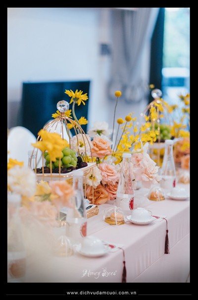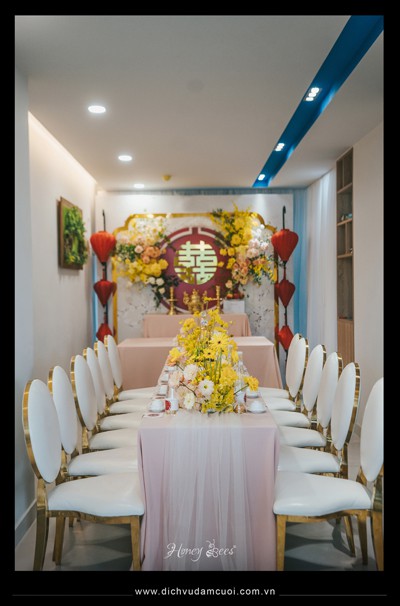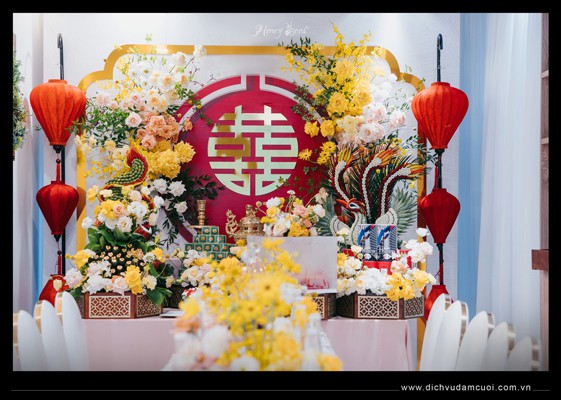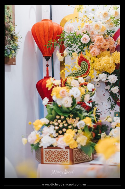 Không gian được lấp đầy bởi những gam màu rực rỡ và ấm cúng như đỏ, vàng, cam … tô điểm thêm chút sắc trắng nhẹ nhàng, thanh lịch của những đóa hoa, hòa quyện với sự tươi mới từ màu xanh của lá đã tạo nên một chiếc Lễ Gia Tiên vừa mang hơi hướng hiện đại nhưng cũng đầy ắp sự ấm áp và ngọt ngào từ một tình yêu trọn vẹn của hai bạn được lan tỏa khắp mọi nơi.