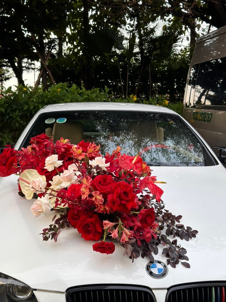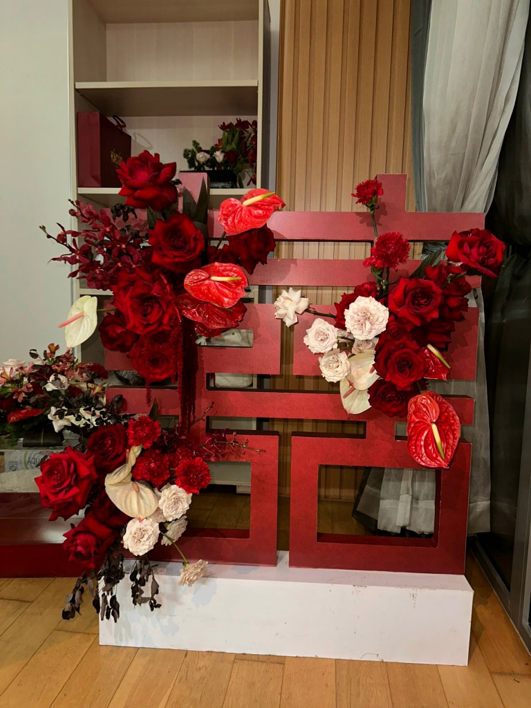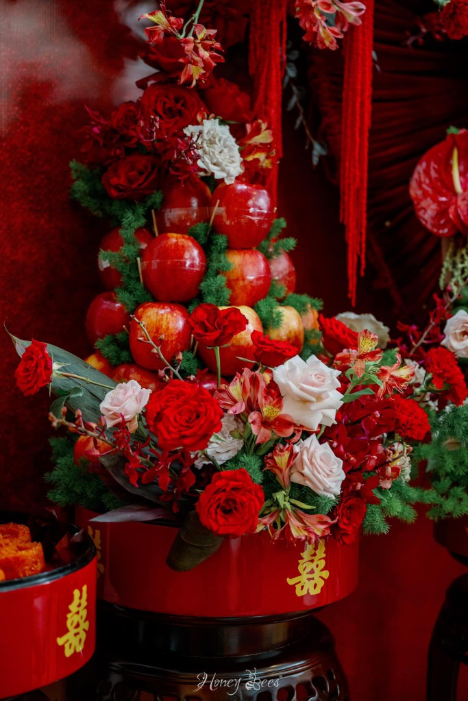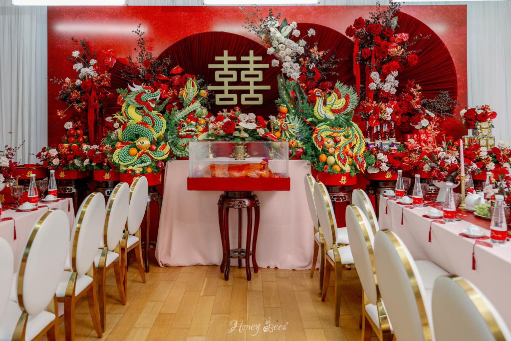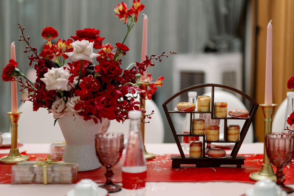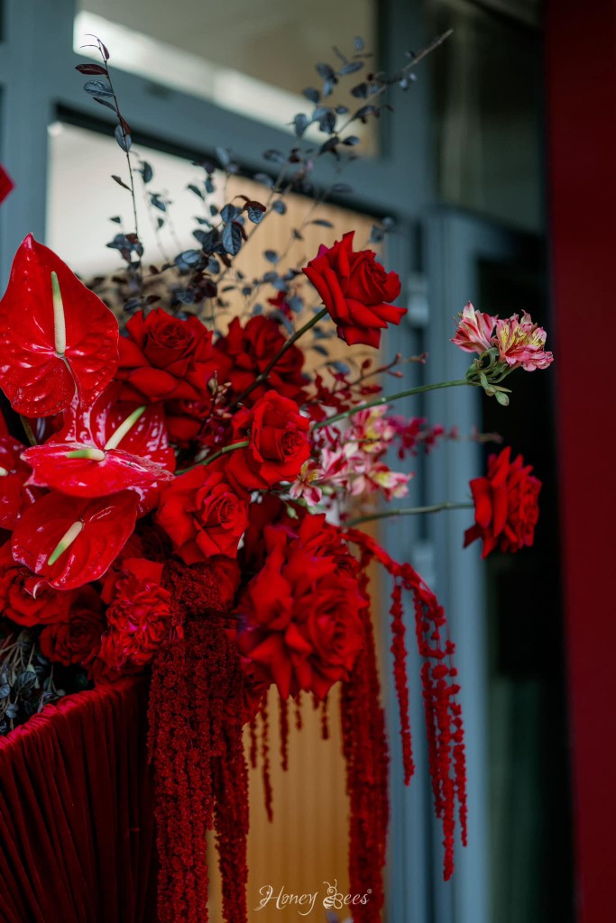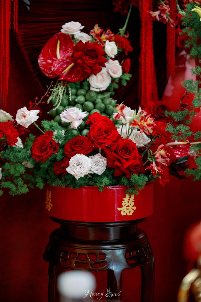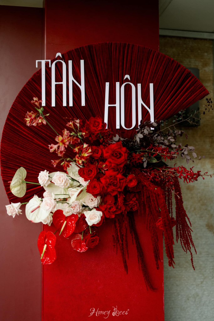 Với những mong muốn của hai bạn và gia đình, HONEY BEES đã lựa chọn kết hợp theo phong cách thanh lịch, sang trọng từ những đoá hoa cùng tone màu, điểm thêm một ít hồng pastel để quan khách có thể cảm nhận được bầu không khí vui tươi, hứng khởi như chào đón “hành trình về chung nhà” của cặp đôi. Thông qua gam màu đỏ mà tụi mình sử dụng trong buổi lễ, từng đường nét tinh xảo được thiết kế như những chiếc cánh quạt xen lẫn là sự sắp xếp tinh tế của hoa tươi đã tạo nên chiếc backdrop mang một tinh thần mới mẻ và độc đáo hơn, nhưng vẫn giữ được nét đẹp truyền thống sẵn có của nền văn hoá Á Đông.