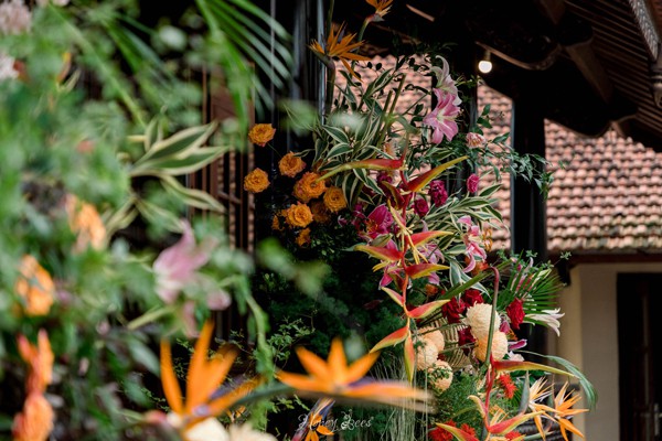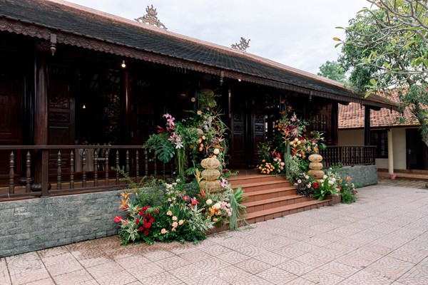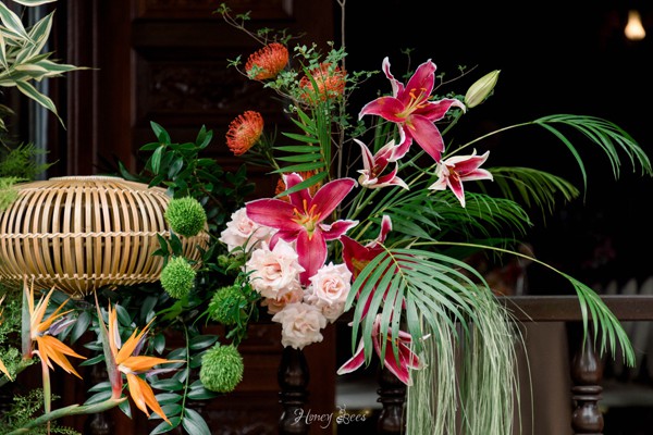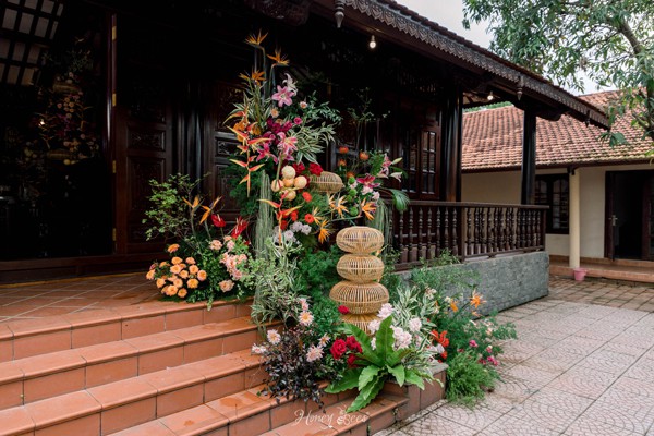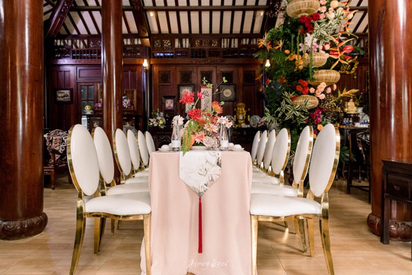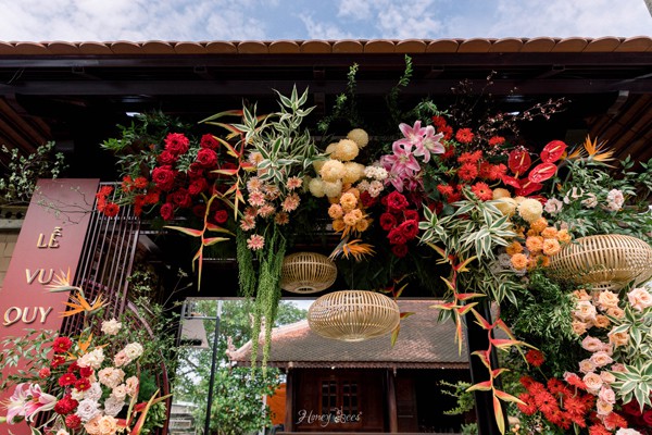 Nếu như ở buổi Lễ Đính Hôn của Ánh & Sơn được Honey Bees điểm sắc bởi sự thuần khiết của hoa sen thì ở Lễ Vu Quy lần này, chúng mình đã khoác lên một dáng vẻ cổ điển với thiết kế đầy trang nhã và cuốn hút bởi những chất liệu mộc mạc như tre, nứa … kết hợp với tone màu đỏ “quốc dân” cùng hơn 10 dòng hoa đan xen với nhau như đang ngụ ý mang đến những nét đẹp truyền thống của quê hương trong một không gian hoài cổ như thế.