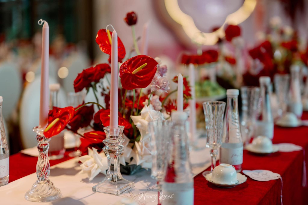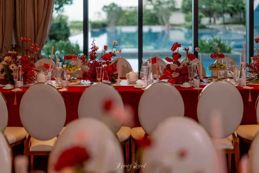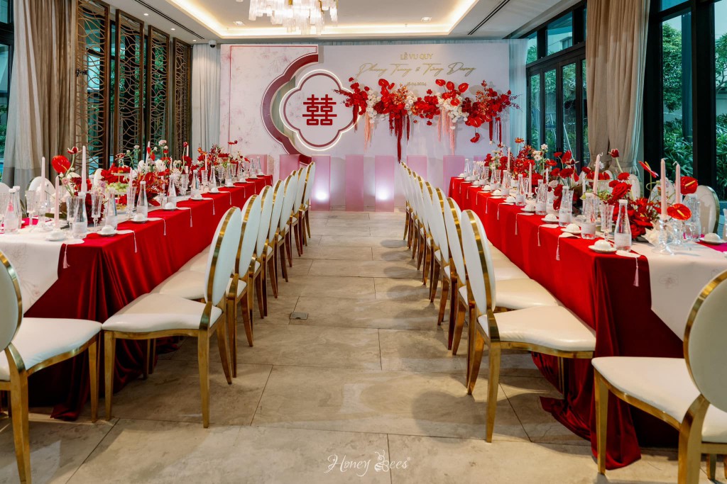 Trong không gian sang trọng của ngôi nhà, sắc đỏ của những bông hoa rực rỡ hiện lên tạo nên một vẻ đẹp cổ điển đầy tinh tế và quyến rũ. Bên cạnh đó, để những hạng mục được tỏa sáng theo cách riêng của nó, Honey Bees đã lần lượt tạo nên những chi tiết mang hơi thở truyền thống xen lẫn nét hiện đại như chiếc cánh quạt, chữ hỷ … nhằm thể hiện được biểu tượng của sự hoà hợp, sung túc và viên mãn trong cuộc sống hôn nhân, và đó cũng chính là những lời chúc phúc mà Honey Bees gửi đến cặp đôi Dương & Trang.