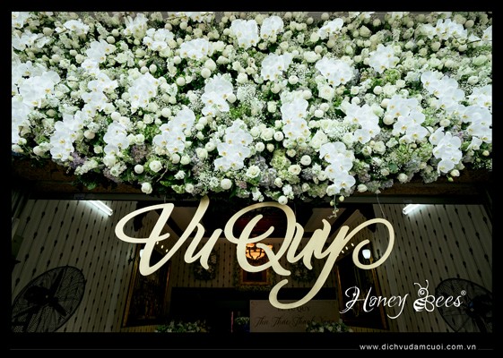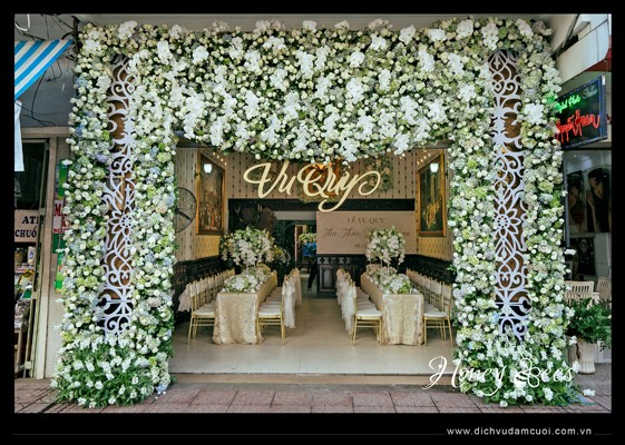 Trang trí lễ gia tiên, trang trí lễ vu quy - cổng hoa tông màu trắng, chữ vu quy vàng đồng