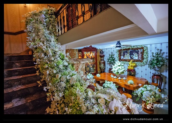 Trang trí lễ gia tiên, trang trí lễ vu quy - hoa tươi trang trí dọc cầu thang lối dẫn lên phòng làm lễ