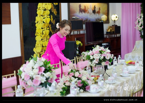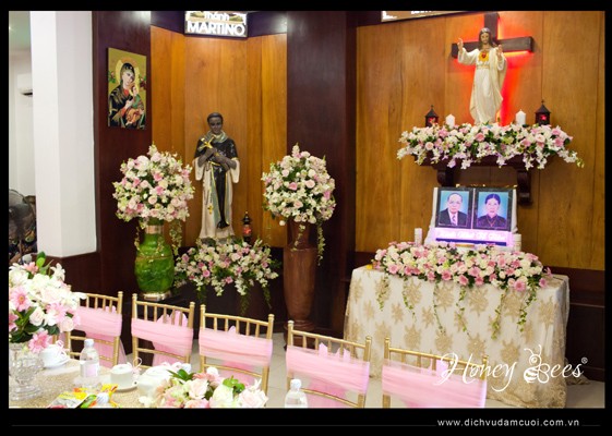 Tông trắng, hồng, vàng đồng và trắng được Honey Bees kết hợp với nhau trong trang trí lễ gia tiên - lễ vu quy của Lệ Hồng & Danh Ngôn. Sau đây mời các bạn tham khảo 1 số hình ảnh trong trang trí lễ vu quy từ khu vực cổng vào, bàn 2 họ, bàn thờ gia tiên và bàn tròn cho bạn bè, người thân: