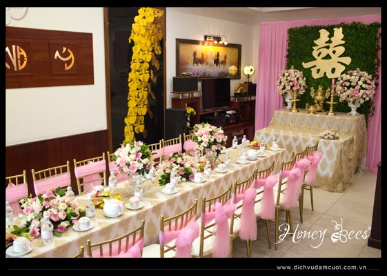 Trang trí lễ vu quy tông hồng, hồng pastel, vàng đồng