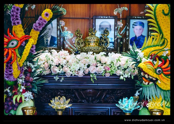 Trang trí lễ gia tiên, trang trí lễ vu quy - bàn thờ trang trí viền hoa tươi và cặp rồng phụng bằng trái cây 2 bên