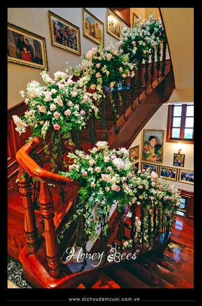 Trang trí lễ gia tiên, trang trí lễ vu quy - hoa tươi trang trí dọc lối lên cầu thang