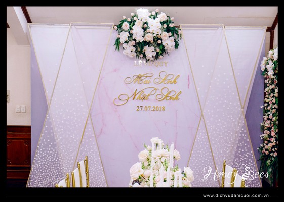 Trang trí lễ vu quy tông trắng, hồng pastel, vàng đồng (Mai Anh & Nhật Anh)
