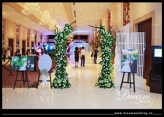 Do số lượng khách lớn nên đám cưới Minh Hoàng & Bảo Châu chiếm trọn không gian 3 sảnh Crystal của trung tâm hội nghị tiệc cưới White Palace nên không gian trang trí khu vực đón khách rất rộng. Dream Wedding đã thiết kế trang trí tiệc cưới của CD & CR theo tông màu chủ đạo là trắng, xanh cốm. Bước vào khu vực đón khách là cổng hoa tươi cây khô dính hoa cắm theo kiểu mộc mạc, phông voal trắng và các cum cây khô được trang trí dọc lối vào sảnh tiệc, phông chụp hình là những vòng cung cây khô đính hoa tươi. Đến với đám cưới Minh Hoàng & Bảo Châu khách mời sẽ có rất nhiều góc chụp hình để lưu lại những khoảng khắc không gian đẹp trong ngày cưới.