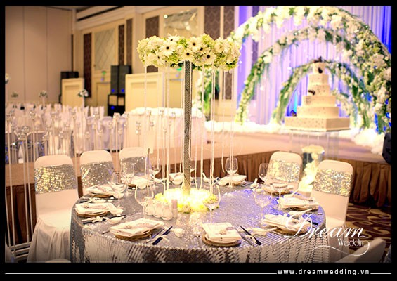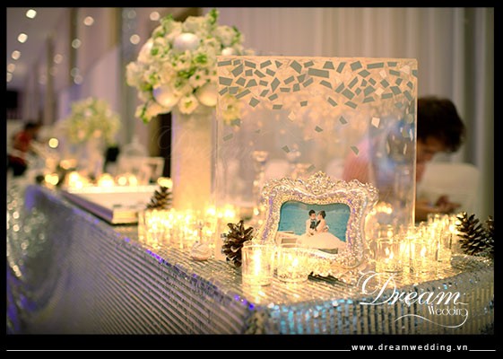 Lễ gia tiên Quốc Trung & Lan Phương tổ chức 1 cách đầy ấn tượng với nghi thức rước dâu bằng vespa thì trong tiệc cưới của anh, chị tổ chức tại trung tâm hội nghị tiệc cưới White Palace được Dream Wedding thiết kế trang trí cũng thật trang hoàng và sang trọng. Với tông mảu chủ đạo là màu trắng cảu các loại hoa tươi kết hợp với màu bạch kim của khăn bàn, các phụ kiện đi kèm,...tạo nên 1 không gian đón khách sang trọng, ấm cúng. Sau đây là những hình ảnh đẹp trong đám cưới của anh, chị mời các bạn tham khảo.