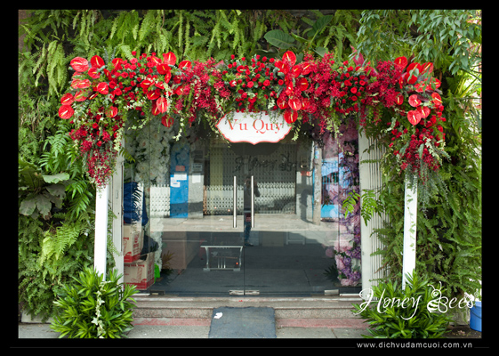Cổng hoa tươi đặt phía trước cổng được cắm theo tông màu đỏ giữa các loại hoa như hồng, lan, hồng môn,..