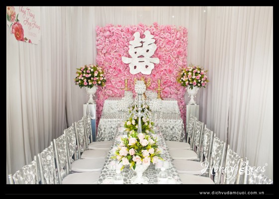 Sự kết hợp giữa 2 màu hồng và bạc trong trang trí lễ gia tiên từ bàn thờ tơ hồng cho đến bàn 2 họ