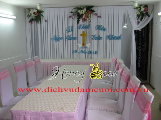 Phông màn trắng kết hợp bàn 2 họ tông hồng