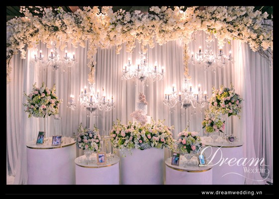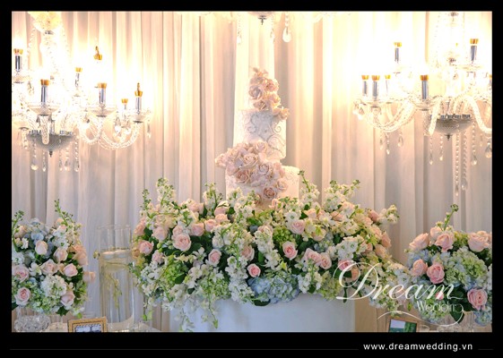 Tiệc báo hỷ của CD Thúy Vy & CR Anh Tuấn tổ chức tại khách sạn Opus được Dream Wedding trang trí dựa theo tông màu chủ đạo là trắng, hồng pastel