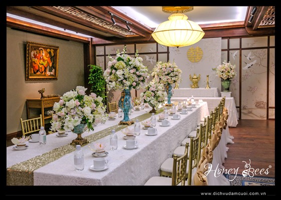 Trang trí tiệc báo hỷ, trang trí tiệc cưới, trang trí đám cưới - hoa tươi, nước suối, ly tách trang trí trên bàn họ