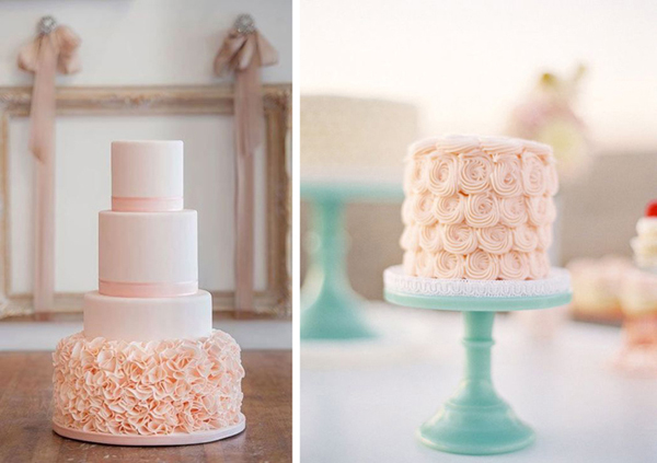 Bánh cưới cũng là một chi tiết quan trọng mà cô dâu chú rể nên chú ý. Những chiếc bánh cưới nhiều màu sắc với kích cỡ quá to có thể phá hỏng không gian tươi mát màu hồng của bạn. Hãy chọn những chiếc bánh nhỏ xinh với những chi tiết trang trí nhã nhặn và tinh tế.
