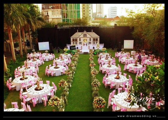 Tổng quan khu vực đãi tiệc khi nhìn từ trên cao, tất cả bàn ghế và các phụ kiện được Dream Wedding mang vào set up cho phù hợp với không gian của buổi tiệc