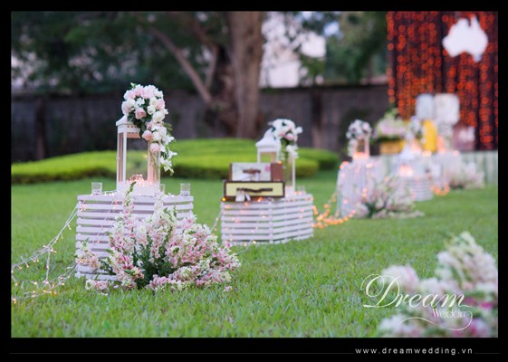 Lối đi lên sân khấu trang trí các đôn gỗ hoa tươi và sân khấu trang trí đèn được đặt trên thảm cỏ xanh tự nhiên