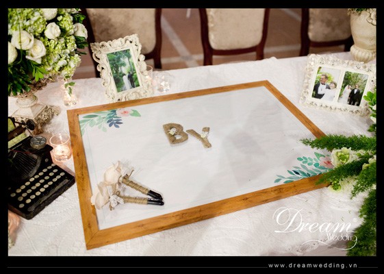 Sổ kí tên là khung gỗ xung quanh, chữ cái viết tắt tên CD & CR đặt chính giữa cùng với bút kí tên được thiết kế riêng