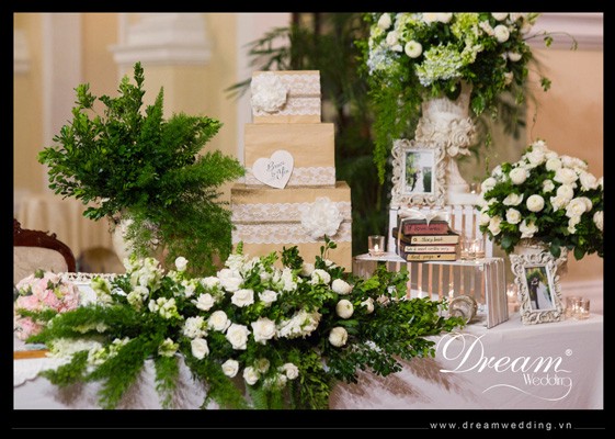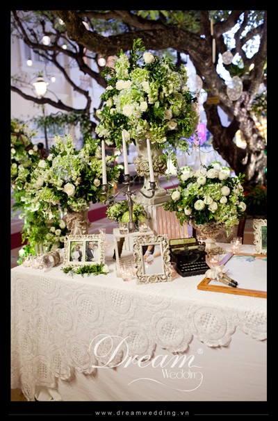 Bàn kí tên đặt phía bên ngoài cổng chỉnh bước vào được trang trí các bình hoa tươi, lá