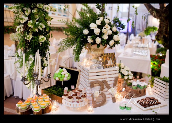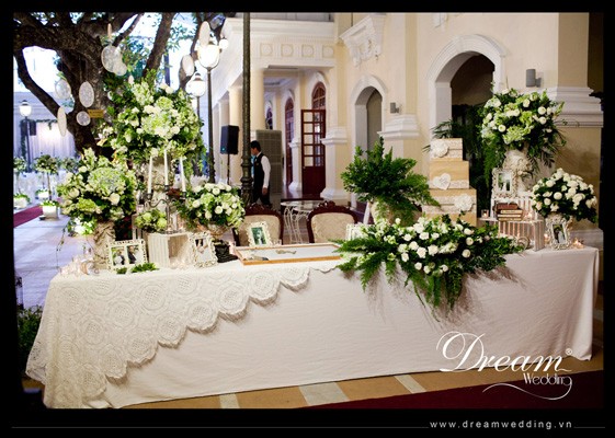 Trang trí tiệc cưới ngoài trời theo tông màu trắng, xanh cốm tại khách sạn Continental
