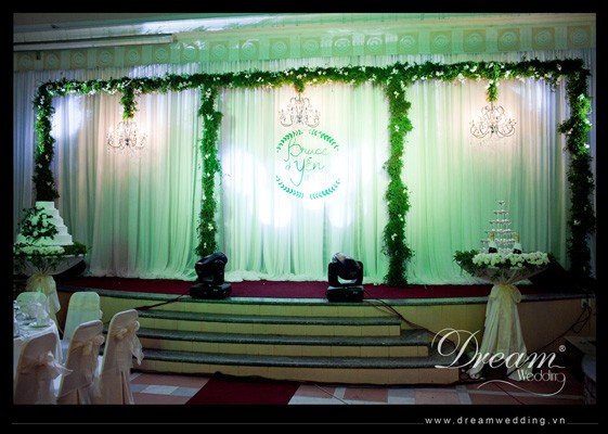 Sân khấu là các trụ được trang trí lá xanh, đính hoa tươi, ở giữa là logo tên CD & CR