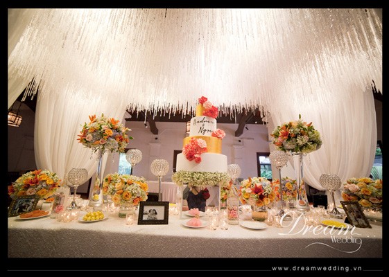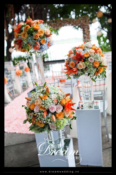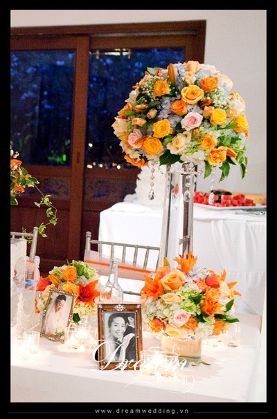 Chị Ngọc liên lạc với Dream Wedding trước đám cưới gần 1 năm và do khoảng cách địa lý nên tất cả mọi ý tưởng và trao đổi đều qua email và Facebook. Chọn màu cam làm tông màu chủ đạo, một màu rất ít được sử dụng trong đám cưới tại Việt Nam.