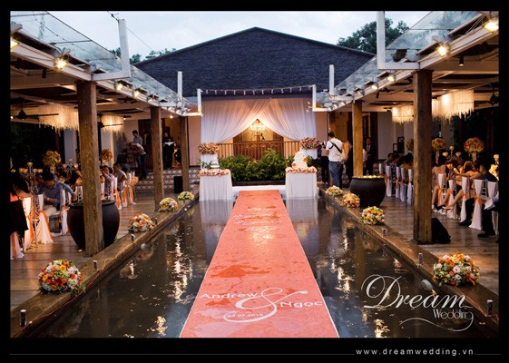 Khung vực làm lễ đặt cạnh bên bờ sông thơ mộng, được trang trí với những chiếc ghế tiffany sang trọng, đôn hoa tươi, cầu hoa....