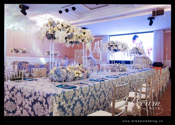 Trang trí sảnh tiệc theo tông màu trắng, xanh biển với các khăn bàn, hoa tươi mà xanh biển kết hợp với phụ kiện màu trắng