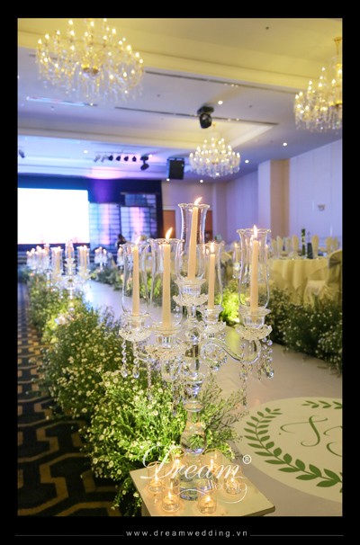 Trang trí tiệc cưới tại Adora Q5, trang trí đám cưới - lối đi lên sân khấu được trang trí các chân nến và những cụm hoa thạch thảo trắng