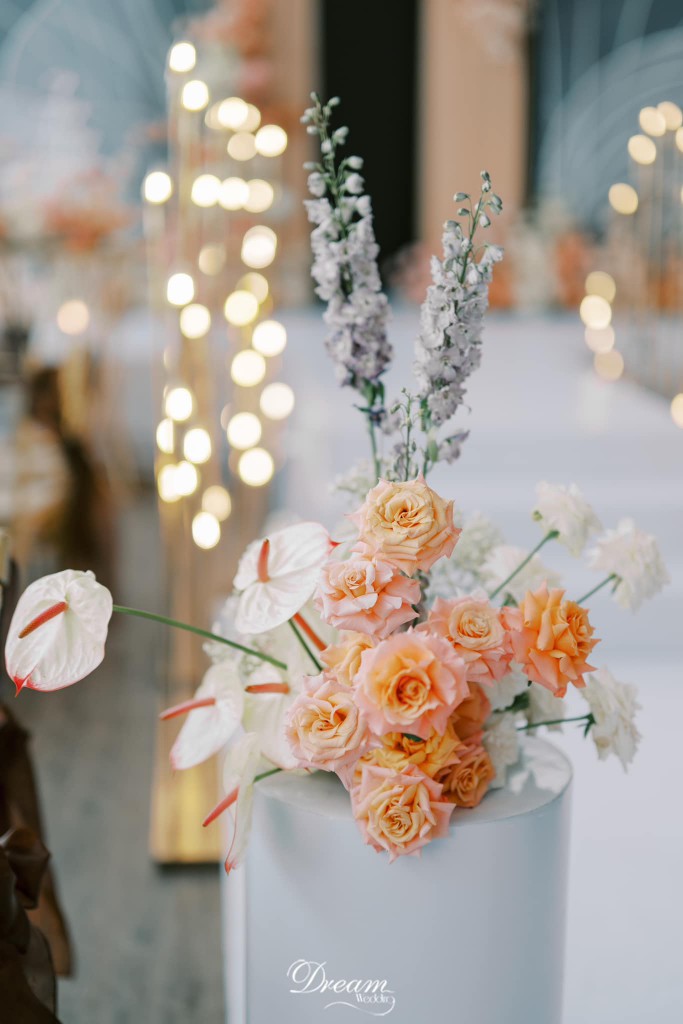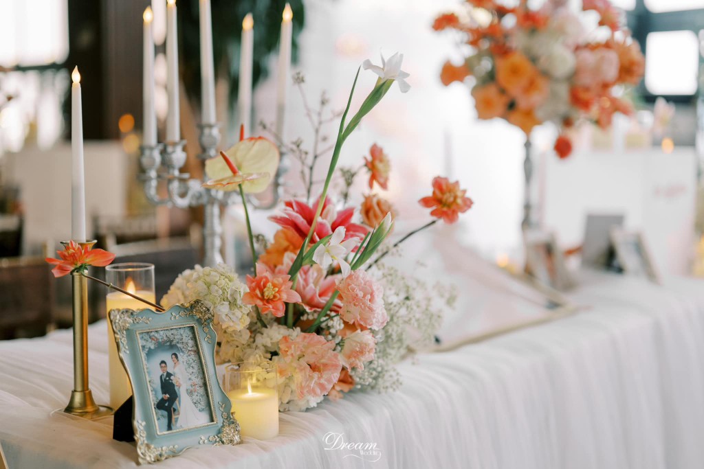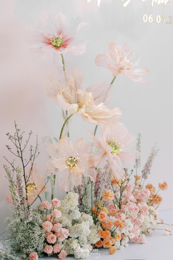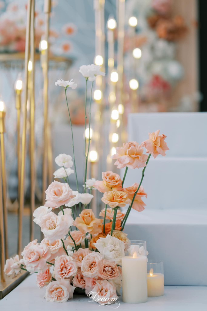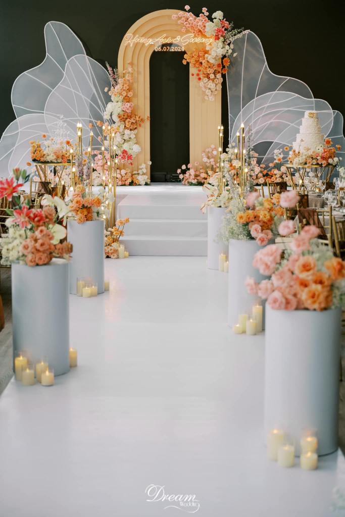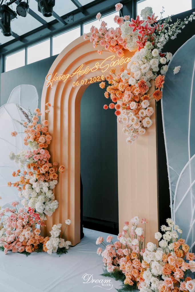 Việc lựa chọn tone màu cam và cách cân bằng làm sao để mỗi tone màu đều trở nên đầy khác biệt, mang ý nghĩa sâu sắc cho buổi lễ cũng nêu bật lên được “tính sáng tạo” của tụi mình. Với sự kết hợp từ các sắc độ hoa, cùng những đường nét uốn lượn được lấy cảm hứng từ hoạ tiết cánh hoa đã biến hoá không gian sảnh rooftop của Capella Gallery Hall trở thành một vườn hoa thần tiên như tiếp thêm phần tự tin cho Soohong & Hoàng Anh sẵn sàng chuyển mình bước vào cuộc sống hôn nhân với muôn vàn màu sắc của sự hạnh phúc và vẹn toàn.