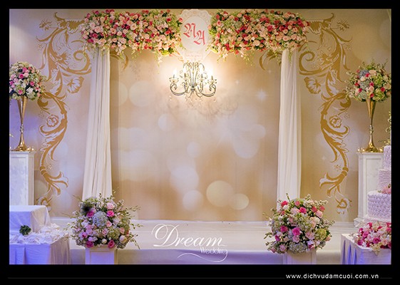 Trang trí tiệc cưới tại Eastin Grand Hotel, trang trí đám cưới - sân khấu in phông họa tiết hoa văn, phía trước là cổng hoa và các đôn hoa tươi