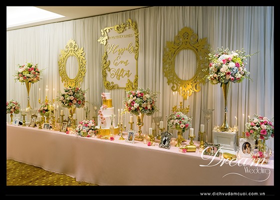 Trang trí tiệc cưới tại Eastin Grand Hotel, trang trí đám cưới - bàn gallery dài được trang trí hoa tươi và các phụ kiện màu vàng