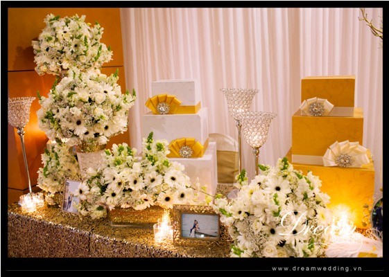 Trang trí tiệc cưới tại Equatorial Hotel với tông màu trắng, vàng (Tấn Phát & Phương Anh)