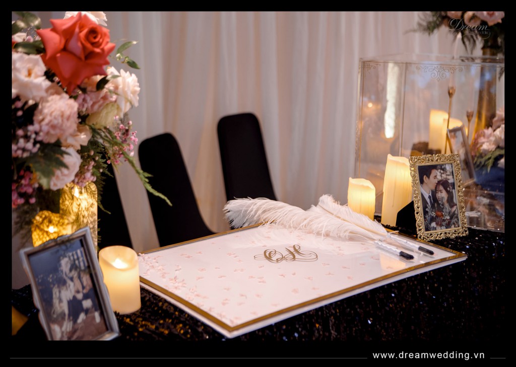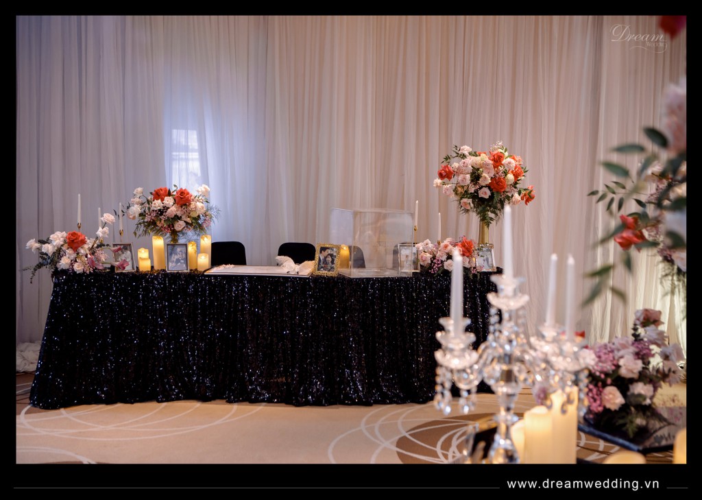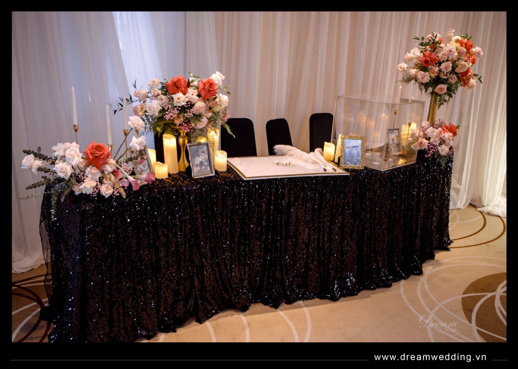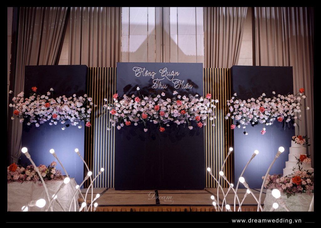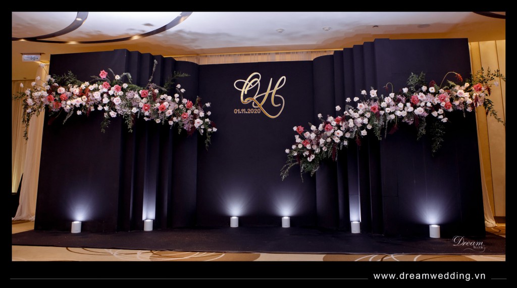 Màu đen là màu làm nền chủ đạo các phông chụp hình, sân khấu và các phụ kiện của tiệc cưới của CR Hồng Quân & CD Thu Hiền