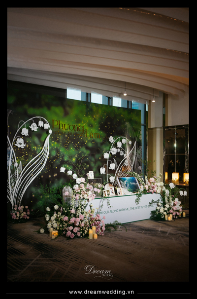 Điểm đặc biệt của buổi lễ là những đoá hoa linh lan được Dream Wedding làm thủ công một cách khéo léo và tỉ mỉ như kể cho mọi người nghe về hành trình tìm thấy nhau thật đẹp của Lâm & Phương và sử dụng nó như một biểu tượng xuyên suốt cả buổi tiệc.