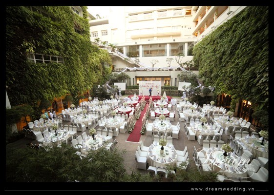 Toàn bộ khung vực sảnh tiệc ngoài trời được bao phủ với các mảng tường lá màu xanh