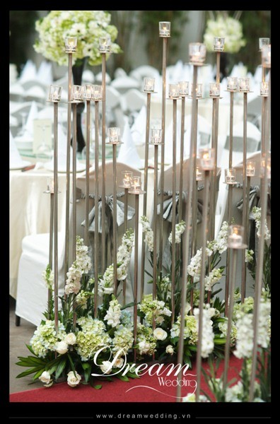 Toàn bộ khu vực lối đi và sân khấu trang trí nến và các đôn hoa tươi