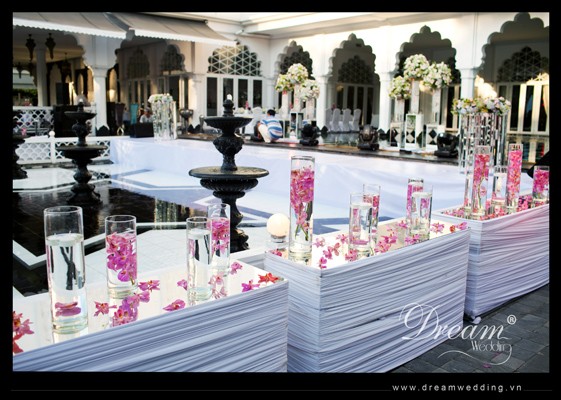 Các đôn kính hoa tươi cao thấp được đặt bên cạnh hồ bơi sẽ là nơi làm lễ lạng mạn cho CD & CR trong buổi tiệc