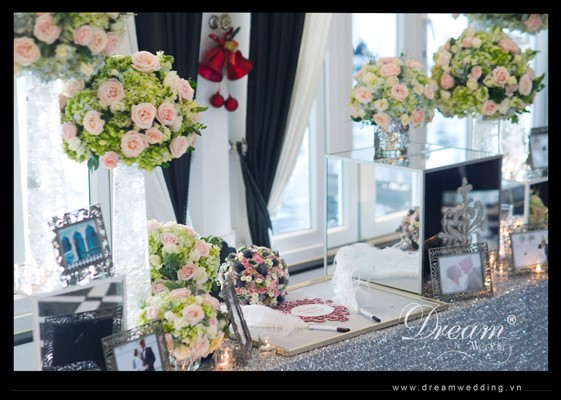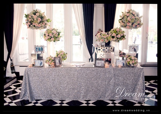Khu vực bàn ký tên đặt tại khu vực đón khách được phủ khăn kim sa màu bạc, trân bàn được trang trí các bình hoa tươi cao thấp đặt xen kẽ với khung hình, thùng tiền,..và các phụ kiện đi kèm
