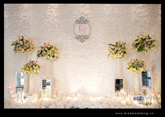 Phông chụp hình được thiết kế đơn giản với logo viết tắt tên CD & CR đặt chính giữa, 2 bên là các bình hoa tươi đặt trên các đôn gương, phía dưới chân được rãi các cụm bông gòn trắng