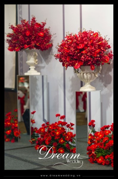 Lối lên sân khấu được trải thảm và các đôn hoa tươi màu đỏ