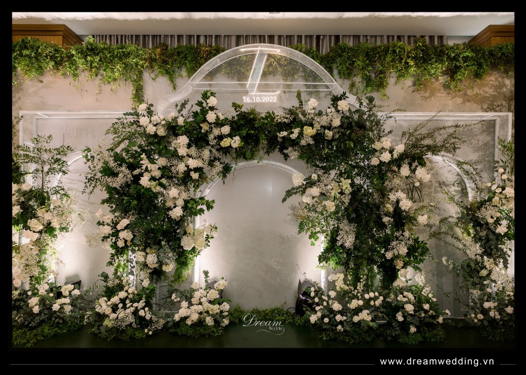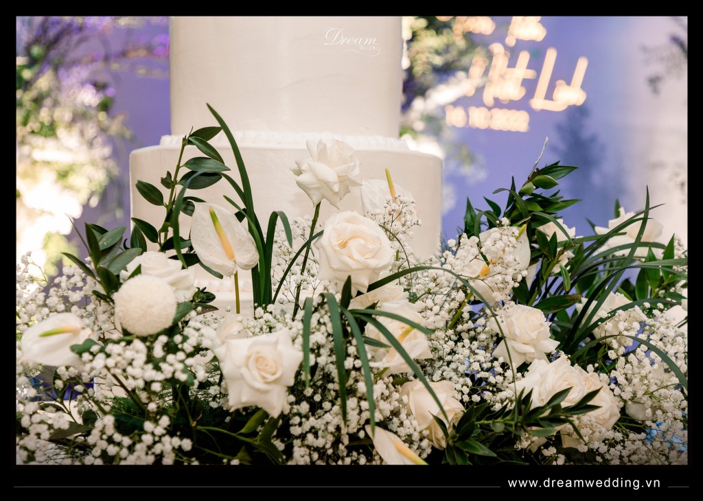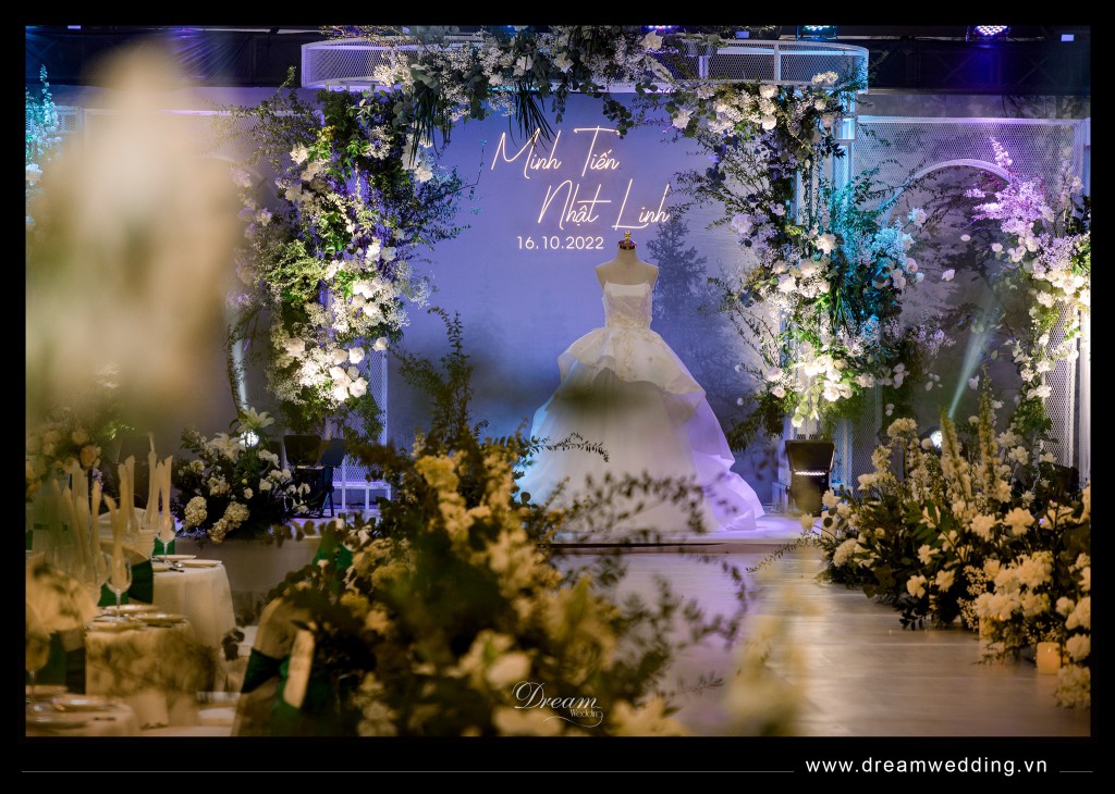 Với thiết kế dành riêng cho chiếc tiệc cưới của Tiến & Linh, Dream Wedding đã sử dụng gam màu trắng tinh khôi và thuần khiết để thể hiện một tình yêu trong sáng của hai bạn dành cho nhau.
