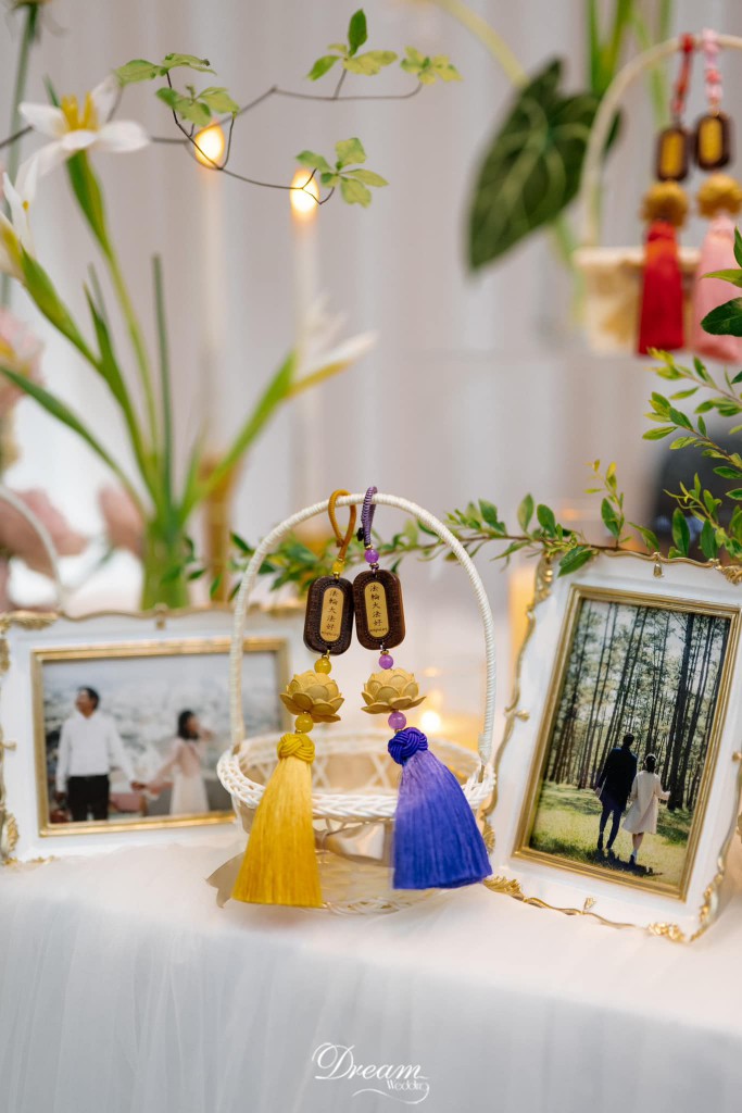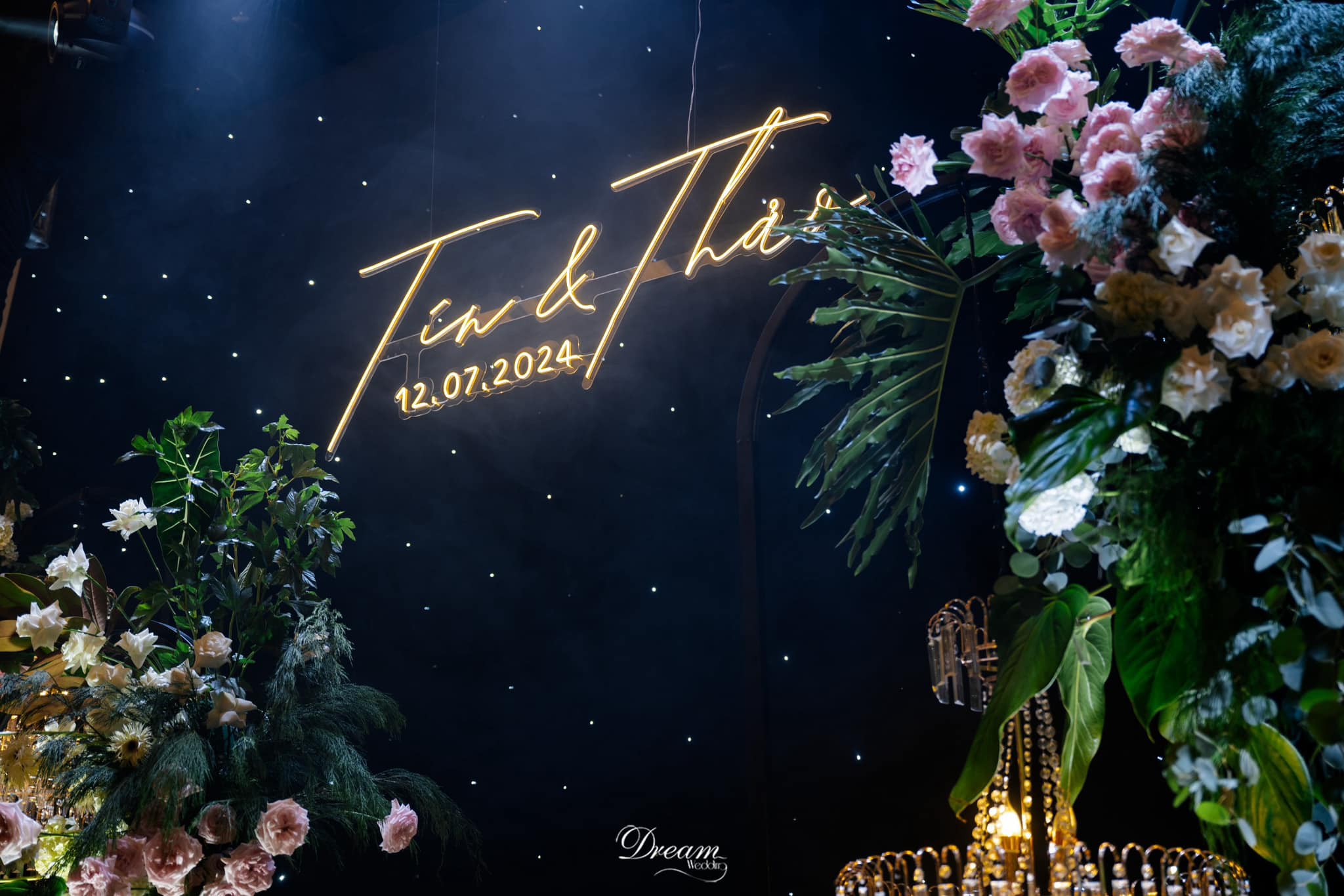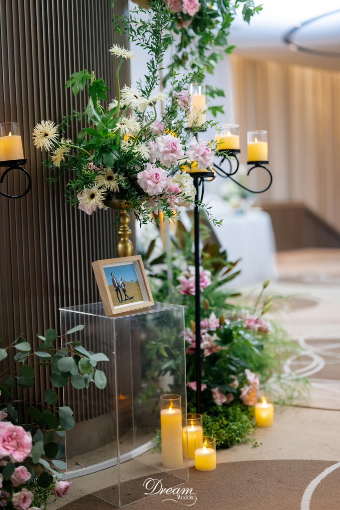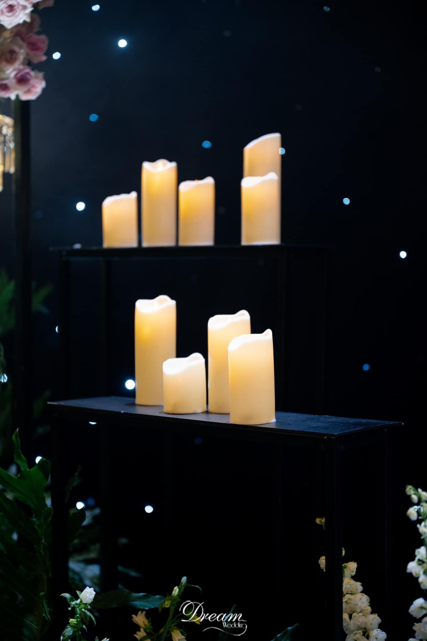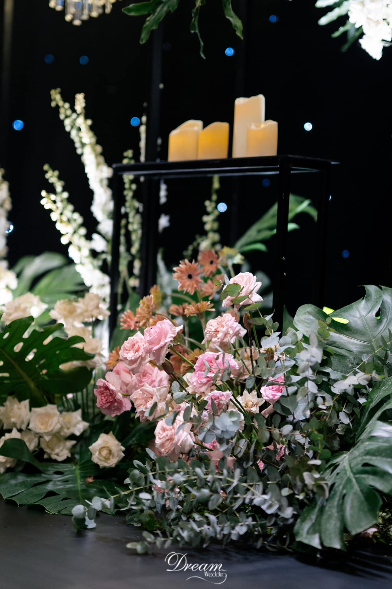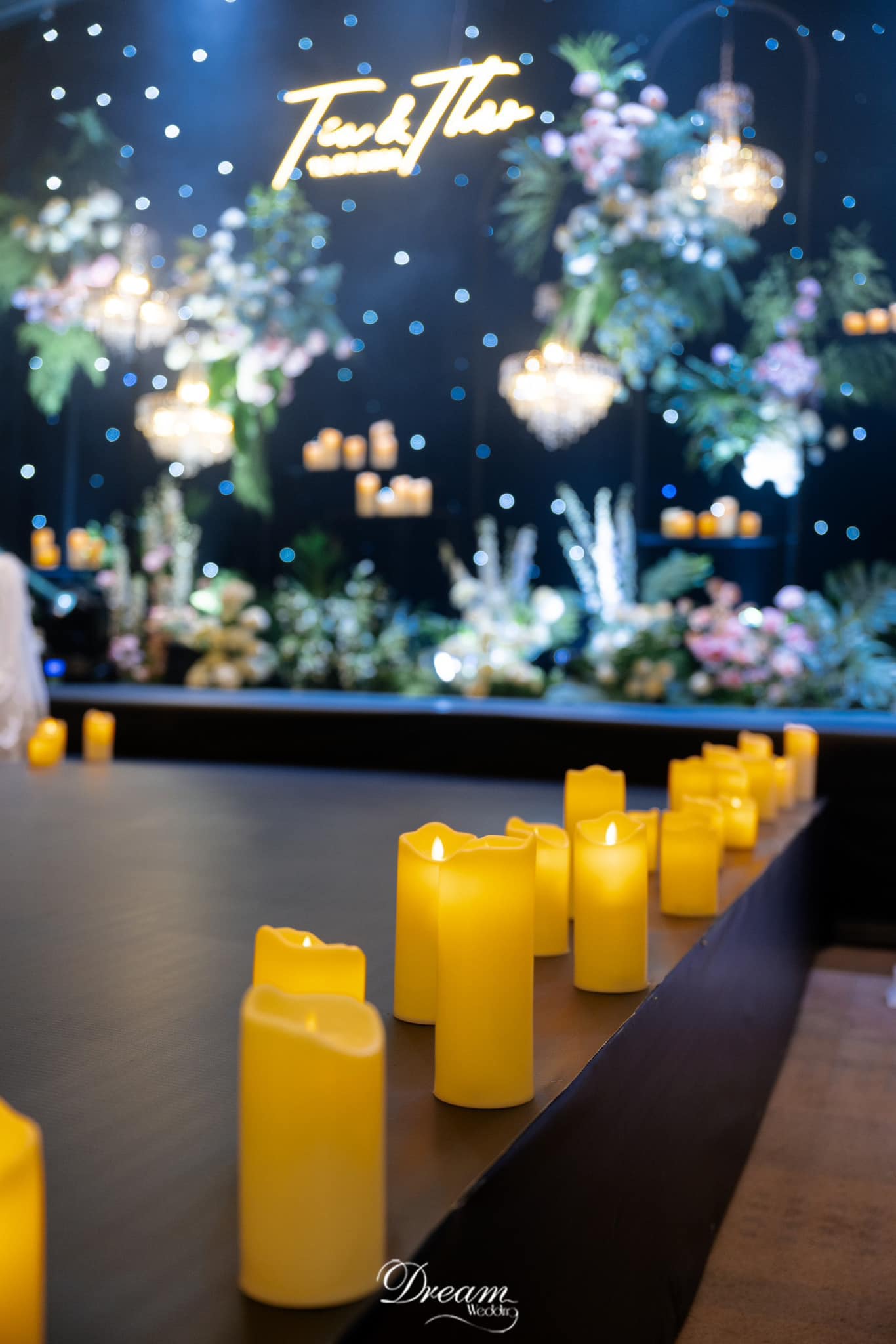 Biết rằng, Tín & Thảo có niềm yêu thích với những điều đơn giản, lãng mạn như nến và hoa. Vì thế mà không gian lễ cưới của hai bạn được sử dụng các chất liệu chủ đạo chỉ là nến, đèn chùm và điểm tô thêm những khóm hoa sắc màu pastel đã tạo nên một khung cảnh hài hòa, nhẹ nhàng và tươi sáng như tình yêu của hai bạn.