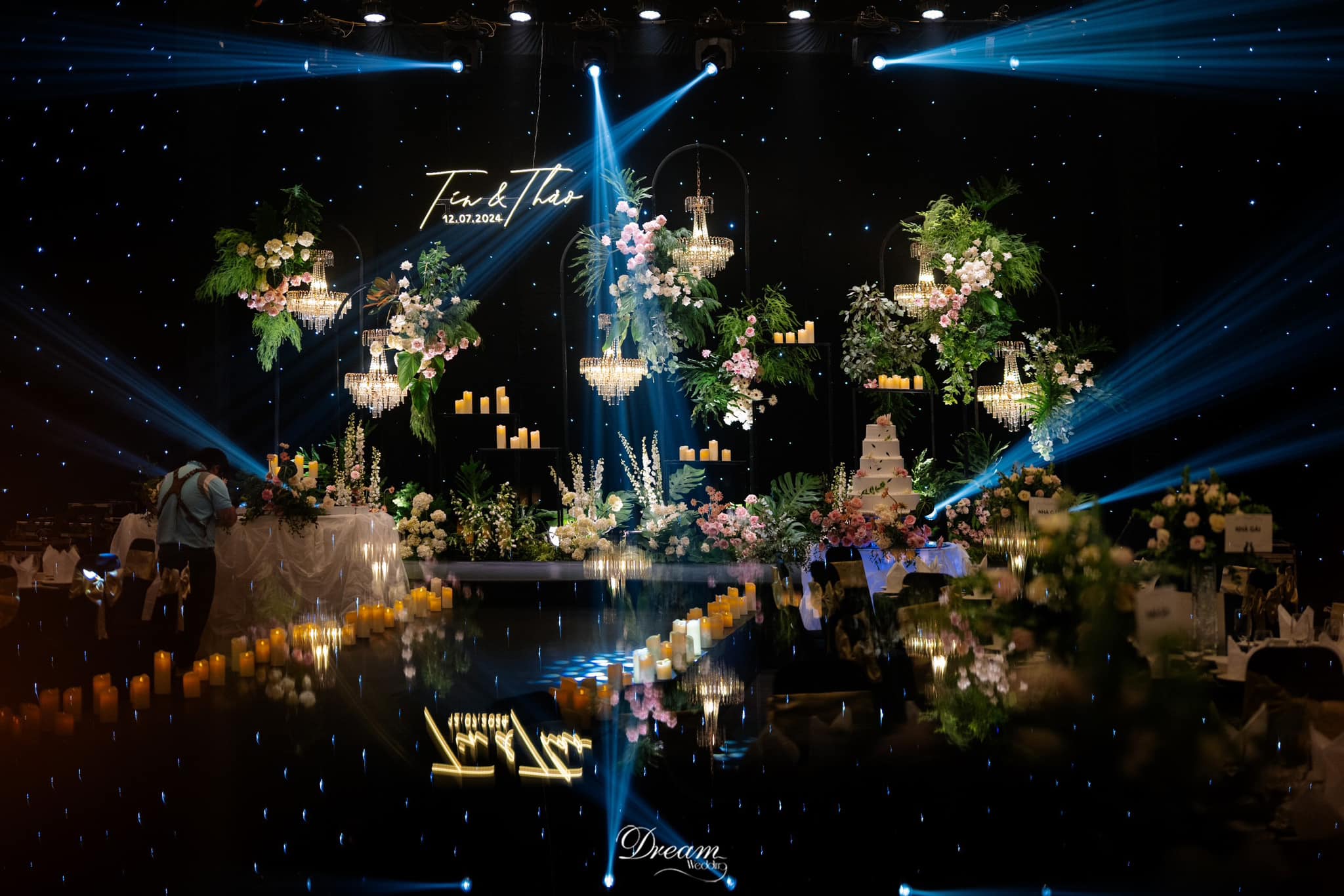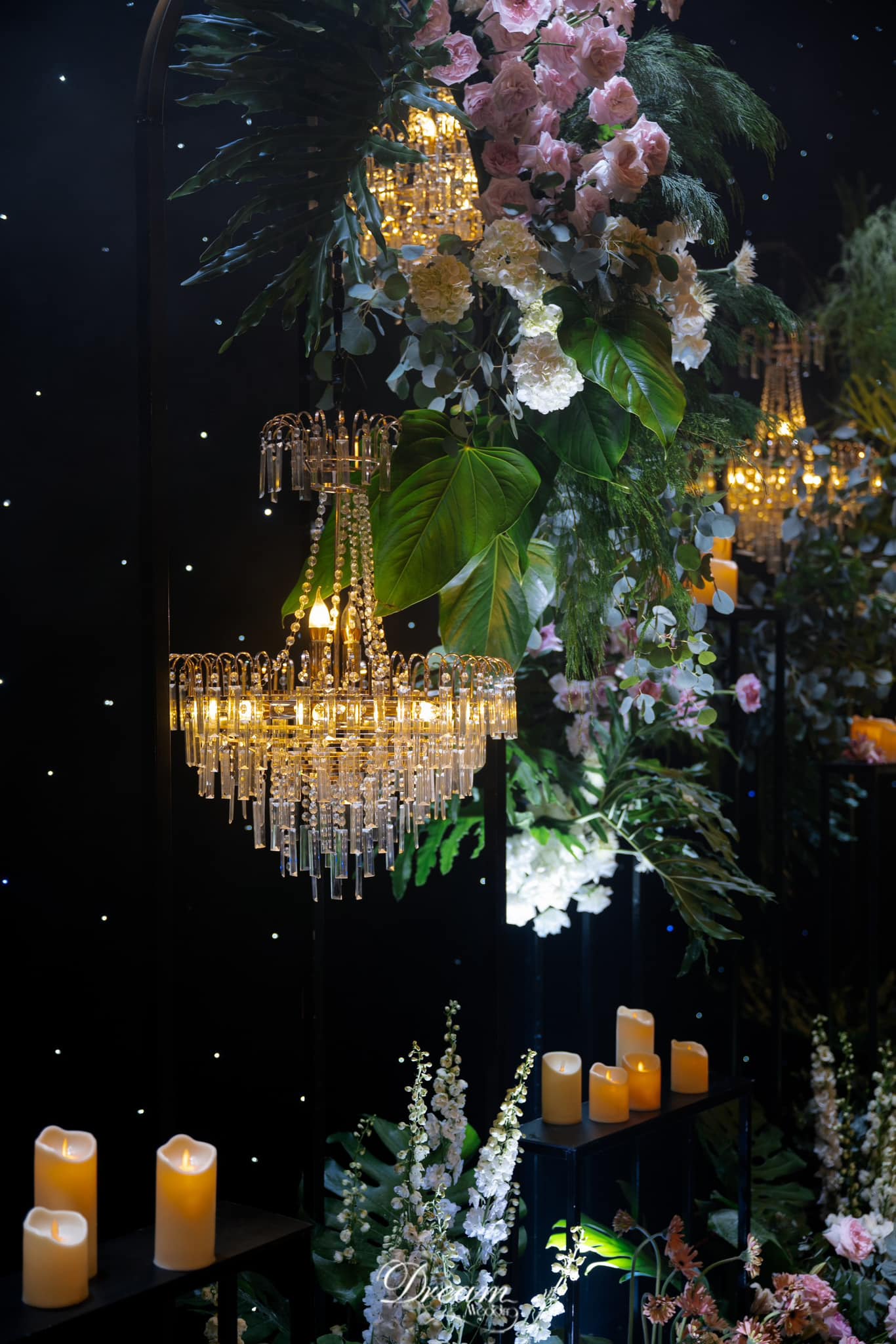 Góp phần làm khoảnh khắc trọng đại của cặp đôi trở nên đặc biệt hơn, không thể nào thiếu đi khu vực sân khấu và hạng mục này chính là điểm sáng trong concept “Eternity Crystal” khi được trang trí chủ đạo bằng ánh sáng của đèn chùm và nến phân tầng, điểm xuyến tinh tế thêm những đóa hoa pastel đang nở rộ như vừa đủ sự choáng ngợp khiến khách mời phải vỡ oà vì quá đỗi sang trọng và đầy thẩm mỹ về mặt “ý tưởng” lẫn “màu sắc”.