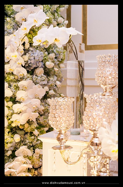 Trang trí tiệc cưới tại Part Hyatt Hotel, trang trí đám cưới - bình thủy tinh, chân nến được đặt 2 bên phông chụp hình