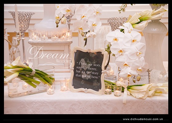 Trang trí tiệc cưới tại Part Hyatt Hotel, trang trí đám cưới - bàn ký tên phủ khăn trắng, trên bàn được trang trí các bình hoa tươi cao thấp