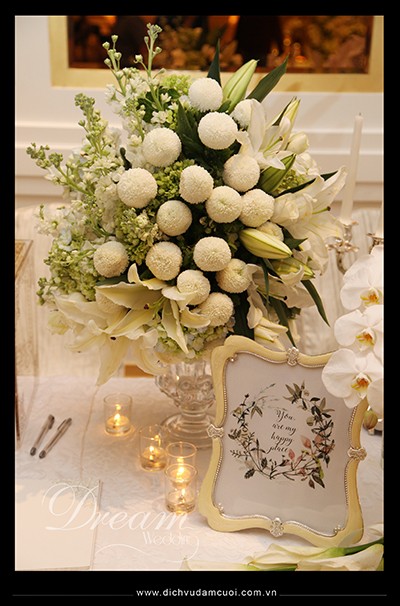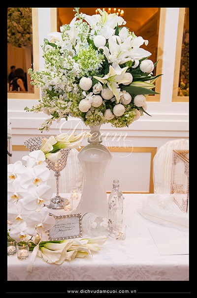 Trang trí tiệc cưới tại Part Hyatt Hotel, trang trí đám cưới - những bình hoa tươi tông màu trắng với kiểu cắm khác nhau