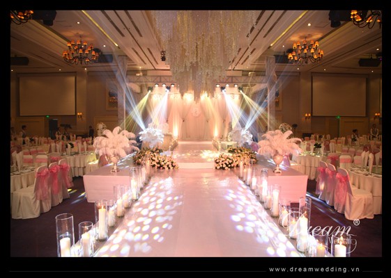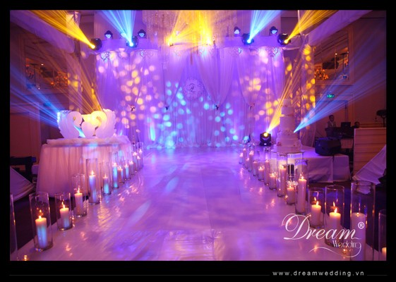 Trang trí tiệc cưới tại White Palace, trang trí đám cưới - voal và và hệ thống ánh sáng được trang trí trên sân khấu