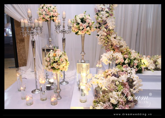 Trang trí tiệc cưới tại White Palace, trang trí đám cưới - hoa tươi nến, được đặt 2 bên phông chụp hình